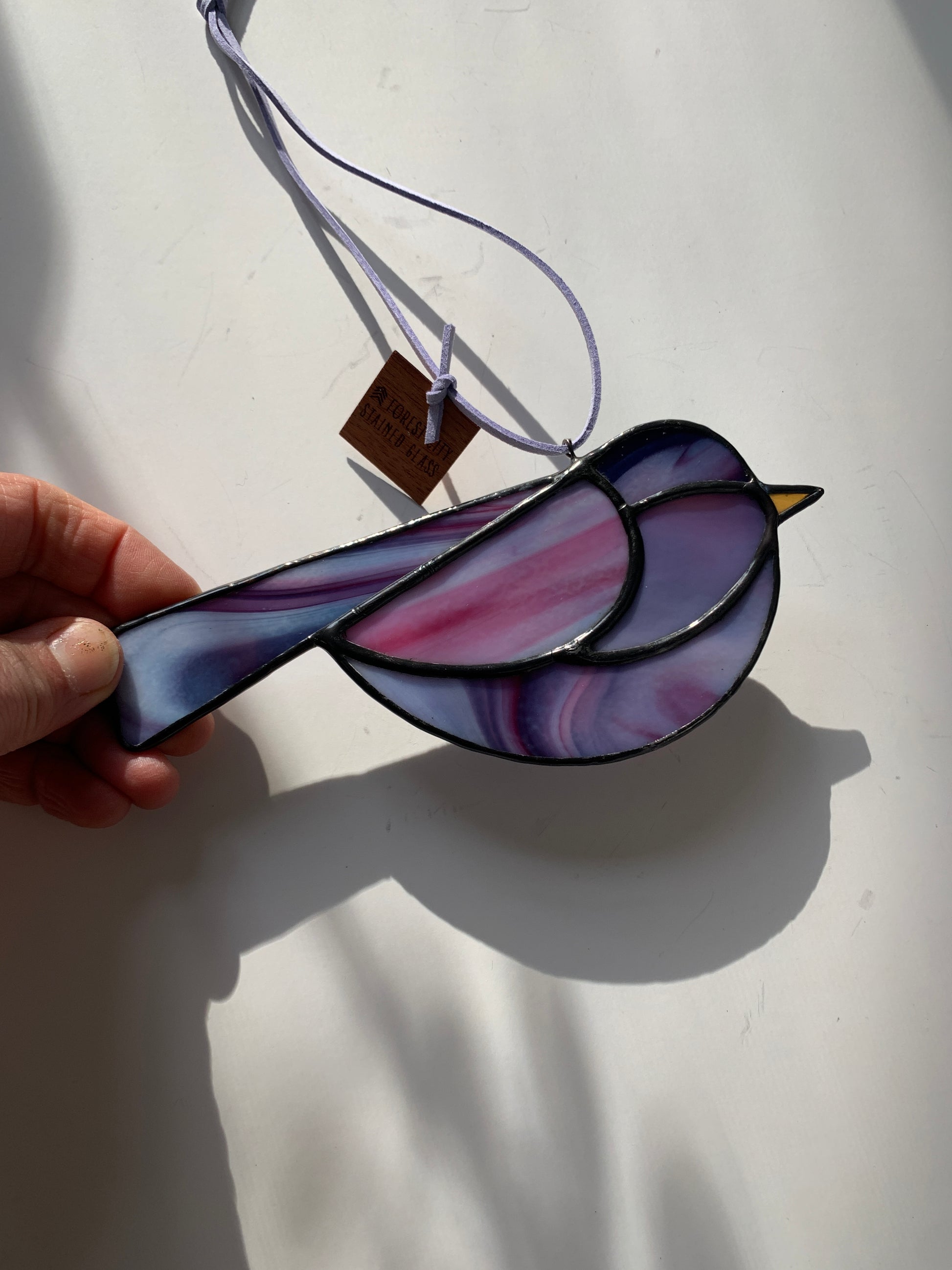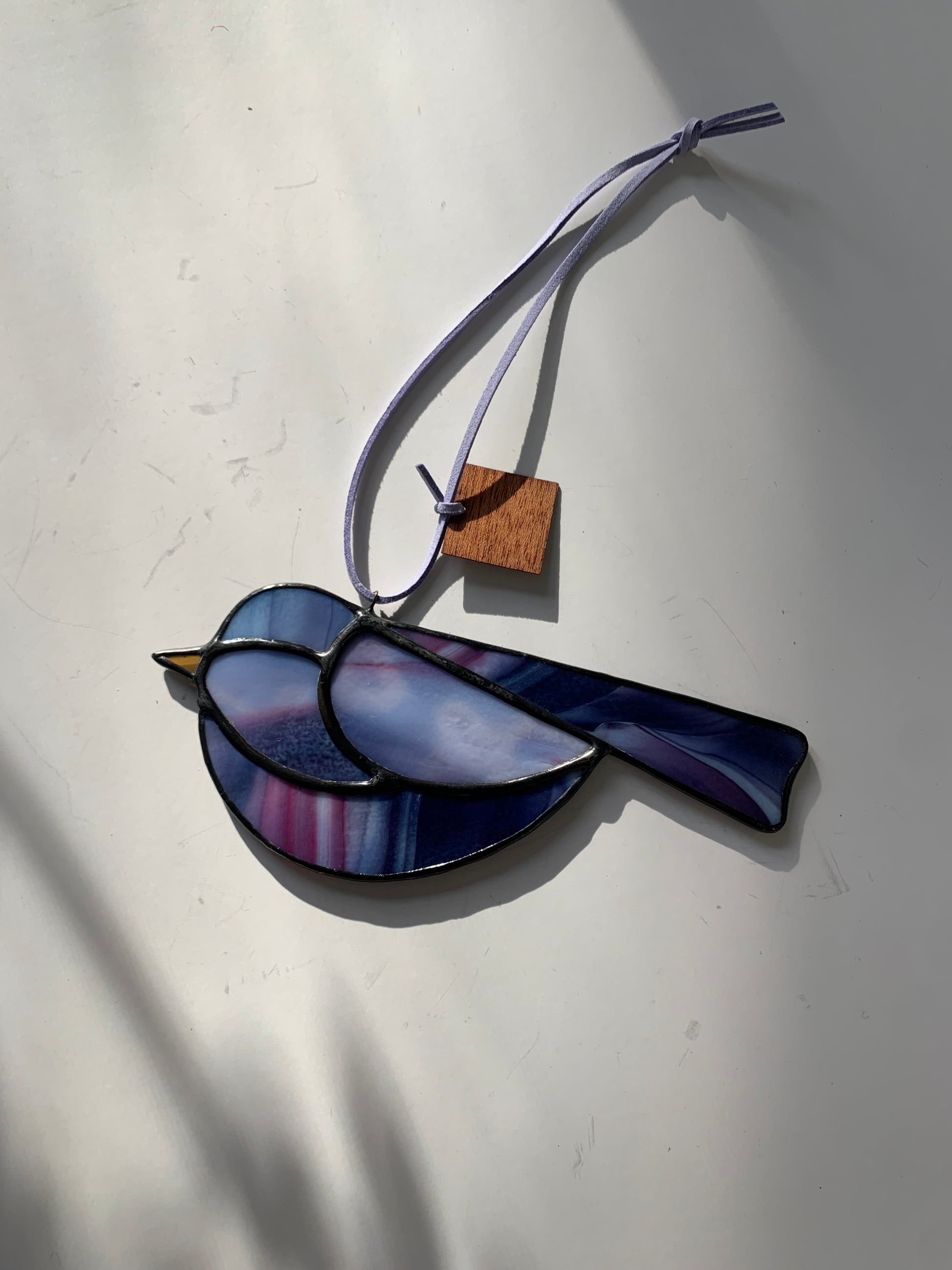 Your colorful little buddy with a joyful song. 🐤 Hand cut from various one-of-kind art glass, finished in a copper patina.