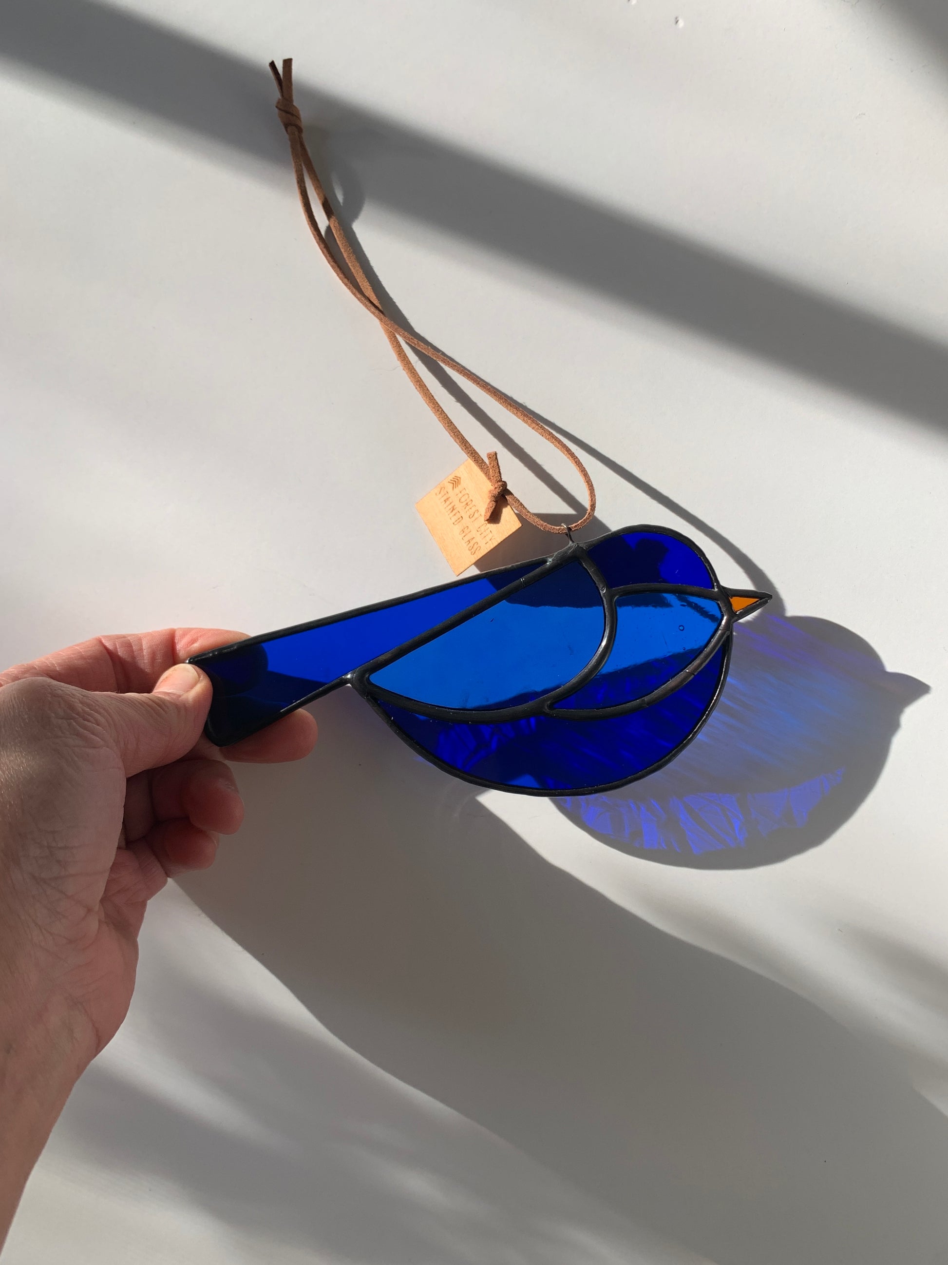 Your colorful little buddy with a joyful song. 🐤 Hand cut from various one-of-kind art glass, finished in a copper patina.