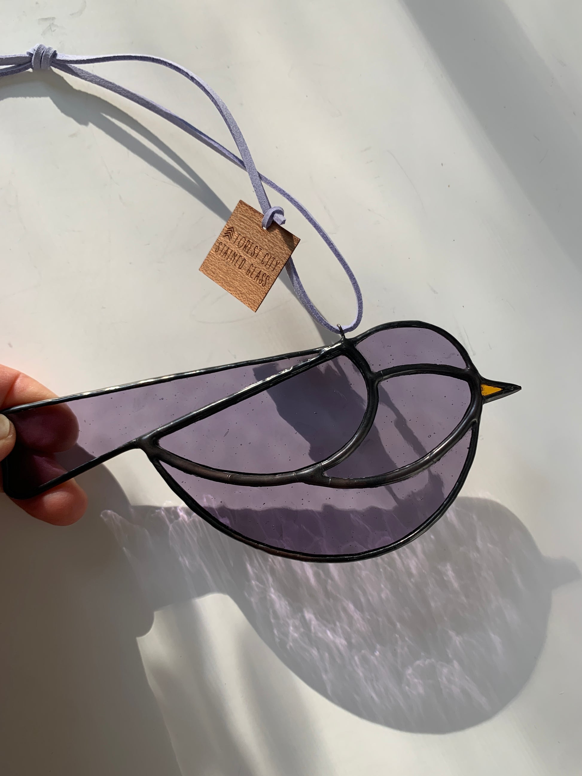 Your colorful little buddy with a joyful song. 🐤 Hand cut from various one-of-kind art glass, finished in a copper patina.