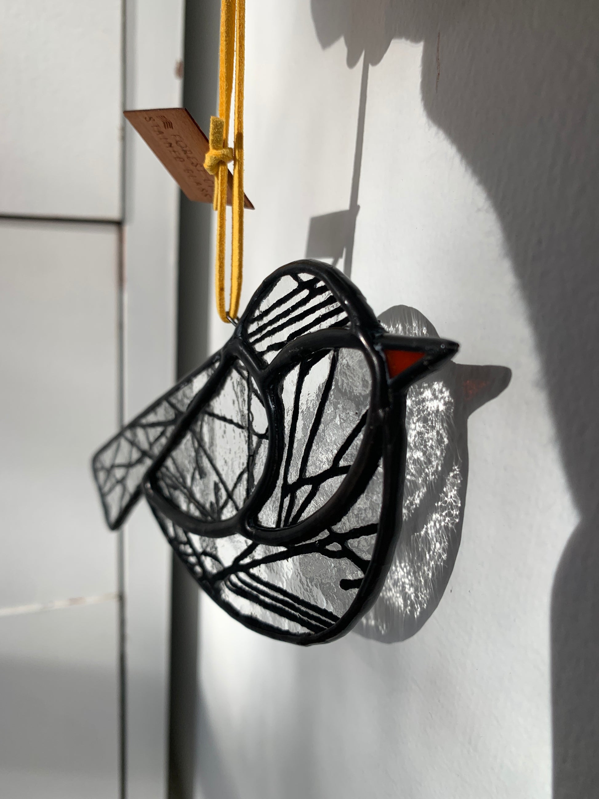 Your colourful little buddy with a joyful song. 🐤 Hand cut from various one-of-kind art glass, finished in a copper patina.