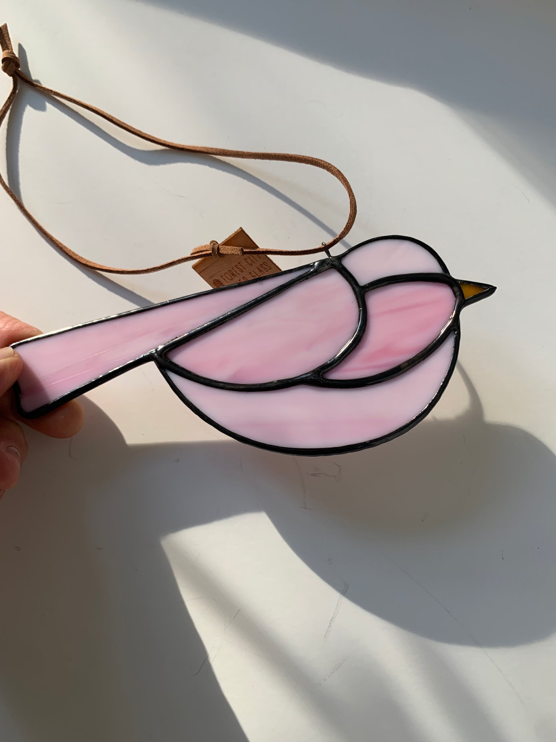 Your colorful little buddy with a joyful song. 🐤 Hand cut from various one-of-kind art glass, finished in a copper patina.