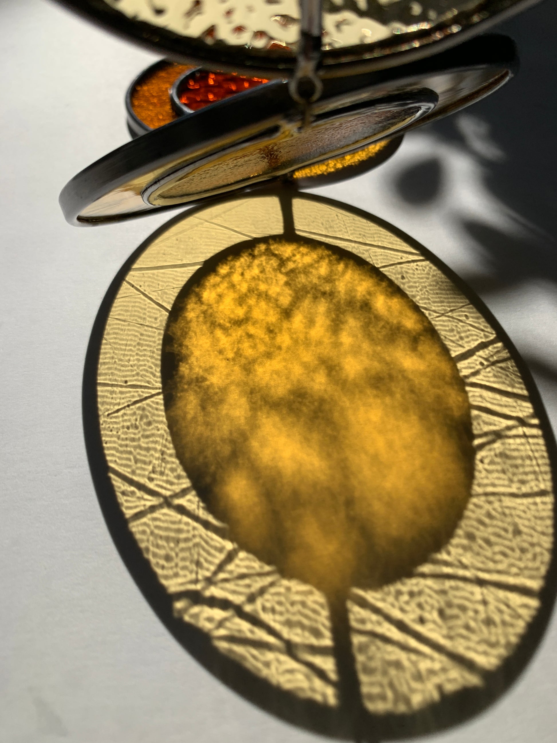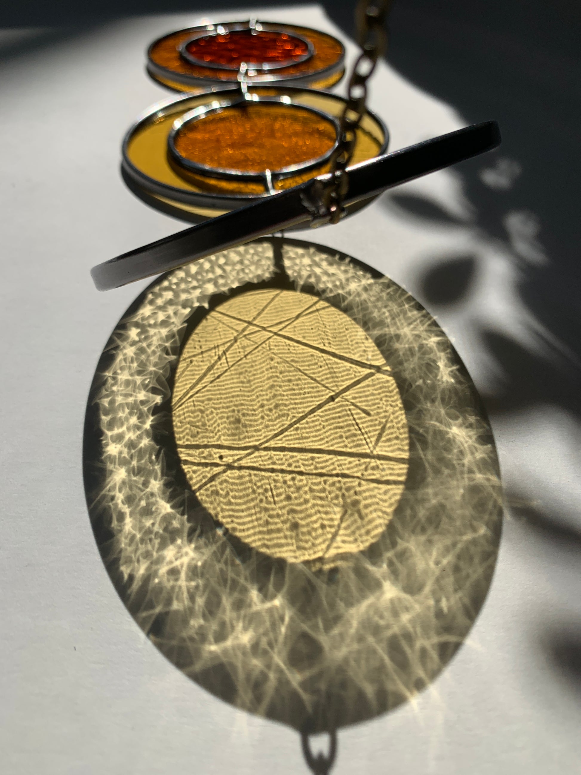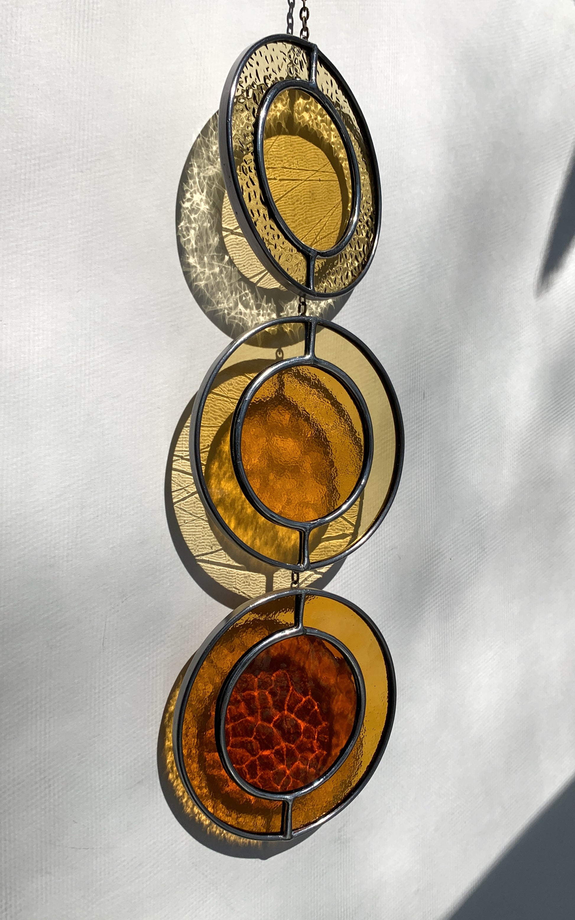 Hand cut from art glass. Measures approx 3.5” x 11.5”, 22” with chain.