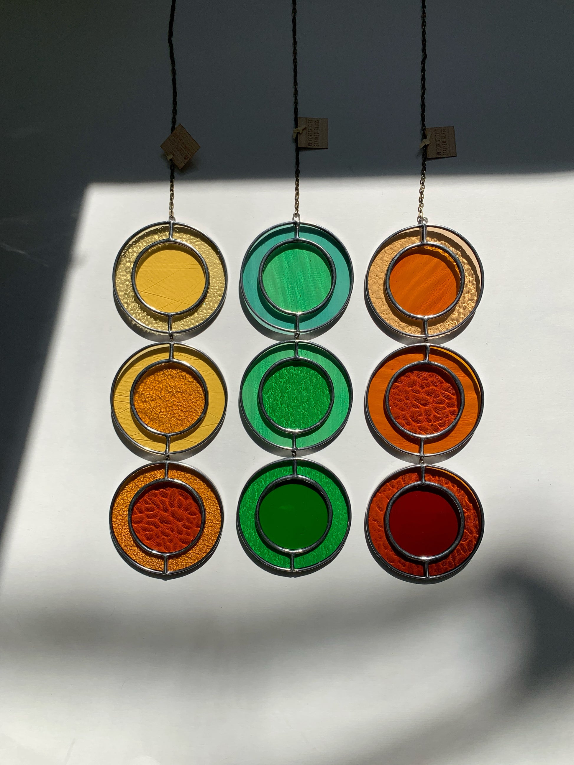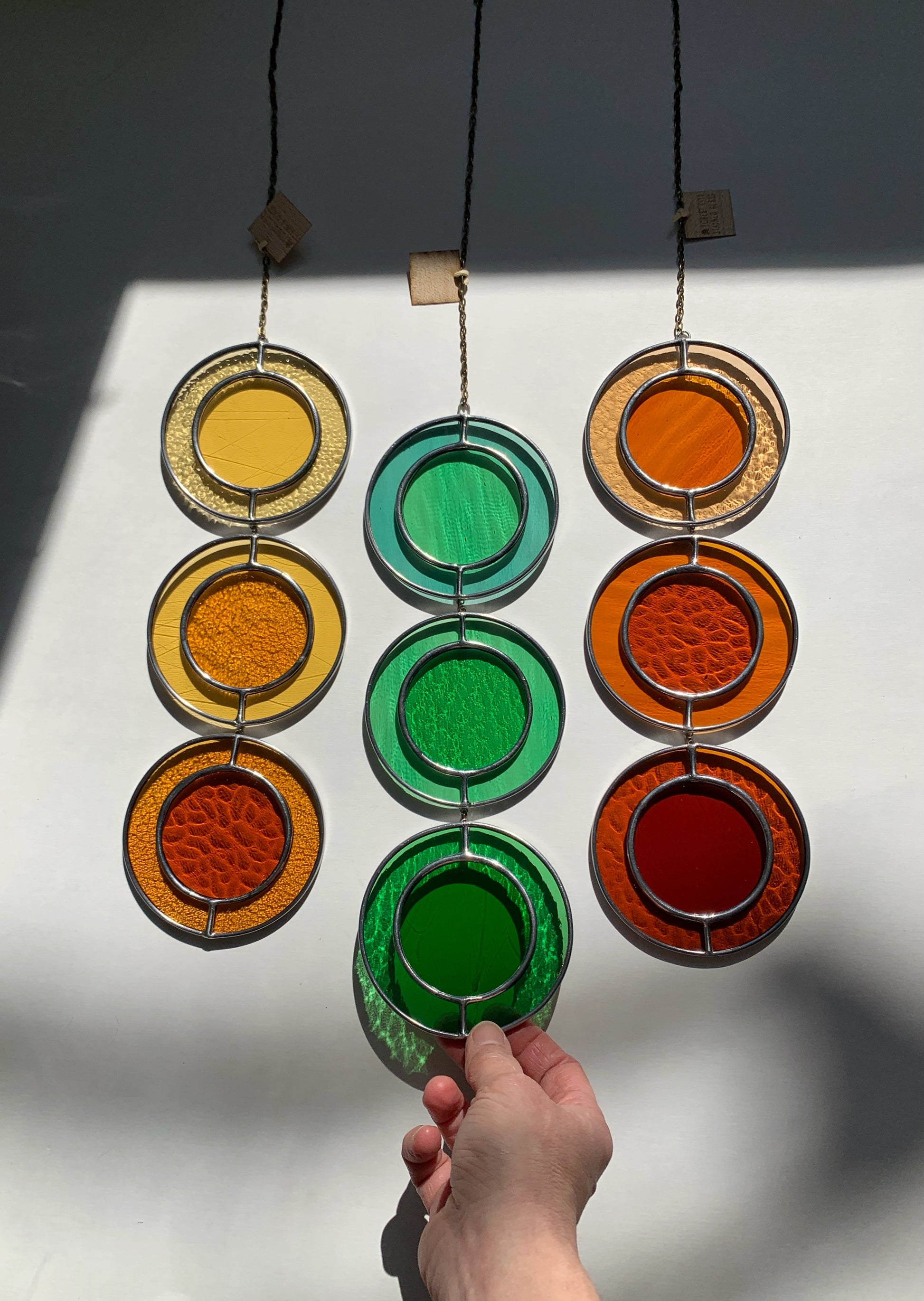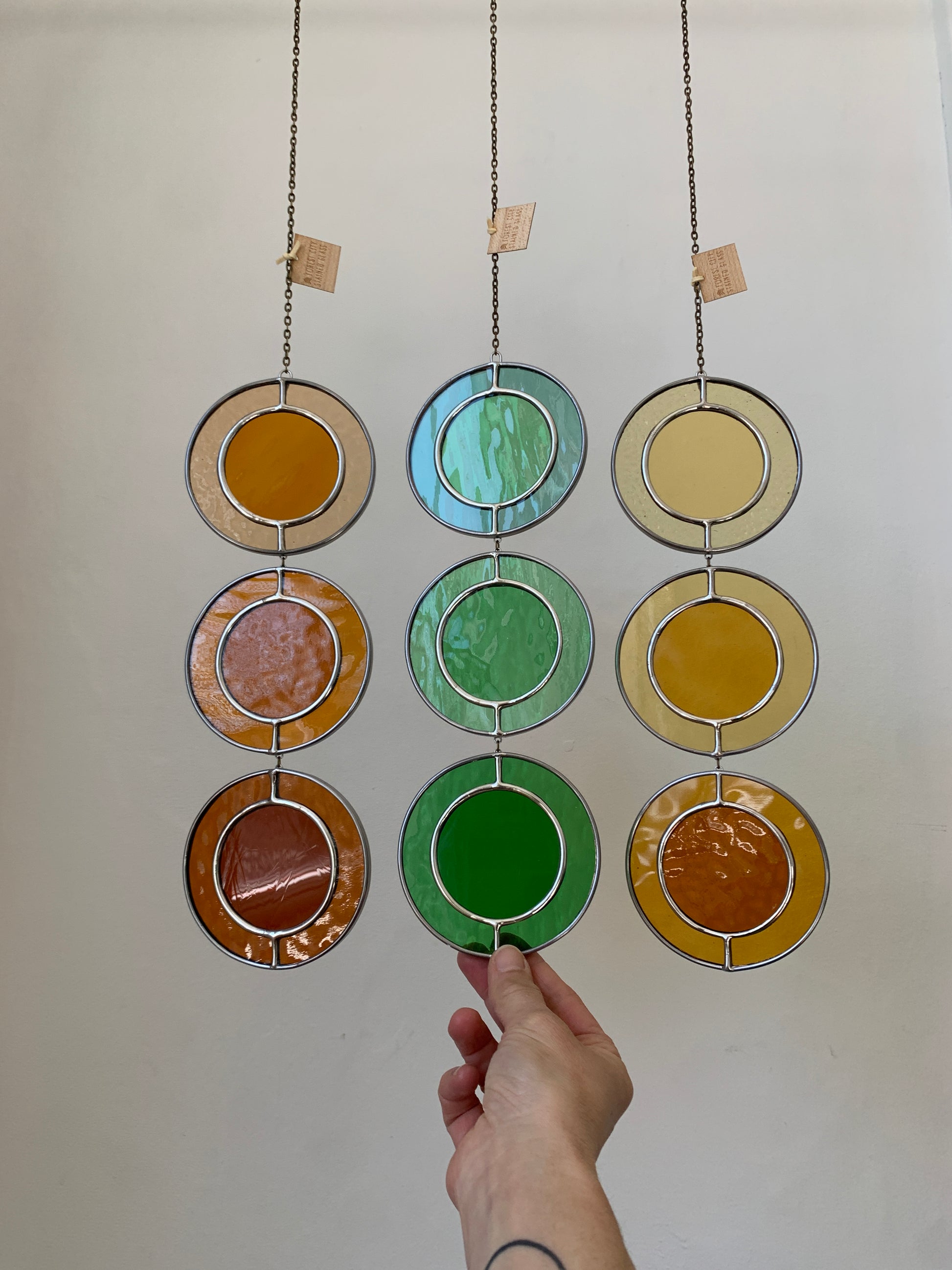 Hand cut from art glass. Measures approx 3.5” x 11.5”, 22” with chain.